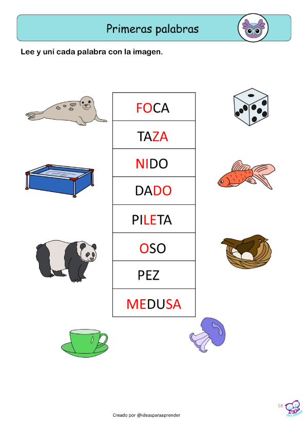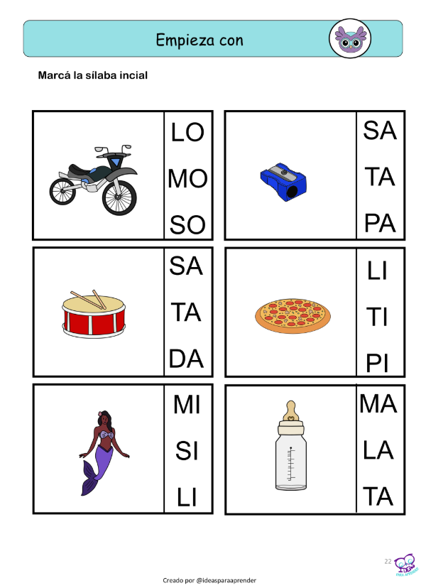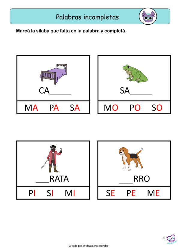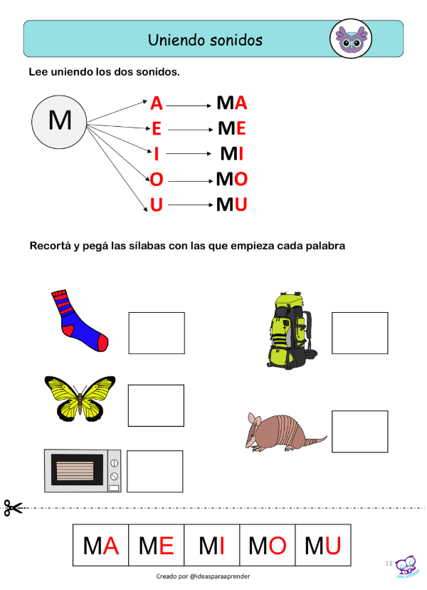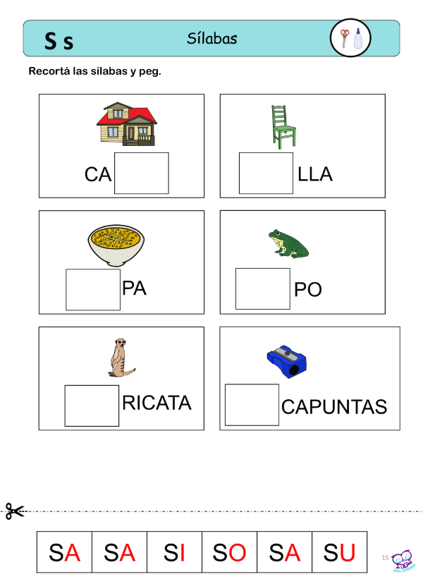 Sobreletras 2 reúne más de 70 actividades que trabajan vocales y consonantes iniciales (m, p, s, l, t, n, f, c, d, b), incorporando combinaciones como ca, co, cu. Incluye ejercicios de conciencia fonológica, discriminación auditiva, formación de palabras y lectura de vocablos simples, con consignas de recortar, unir, completar y escribir.